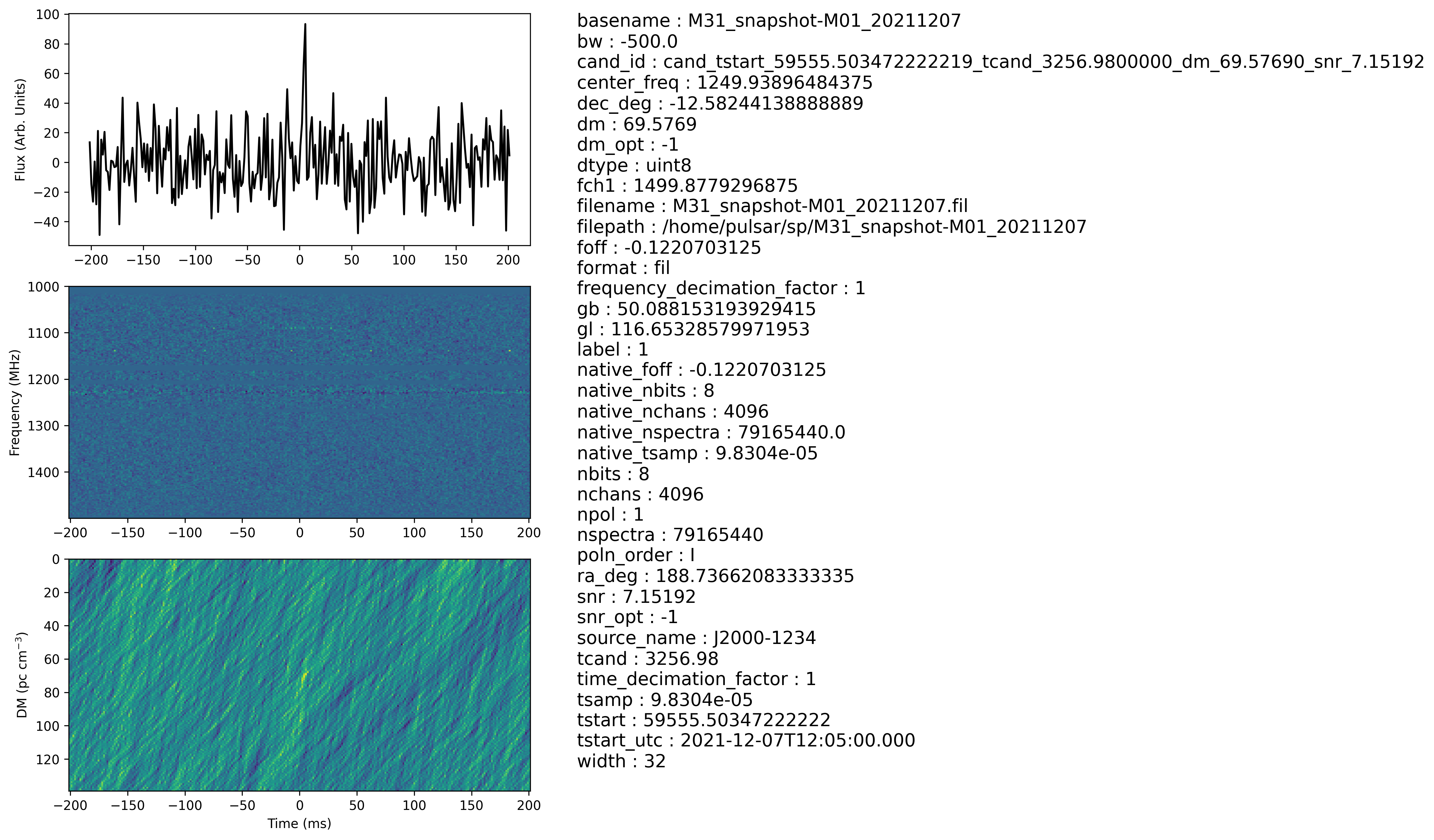 * heimdall/fetch single pulse search (max boxcar 512, DM_max 10000): 1 candidate above S/N 7.0 (DM=70, S/N=7.2, p=0.99977976)