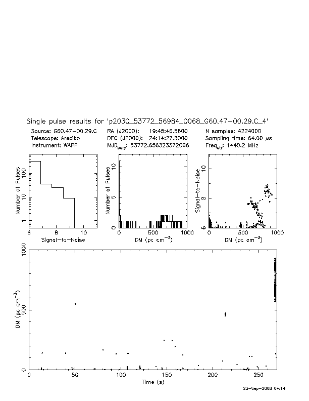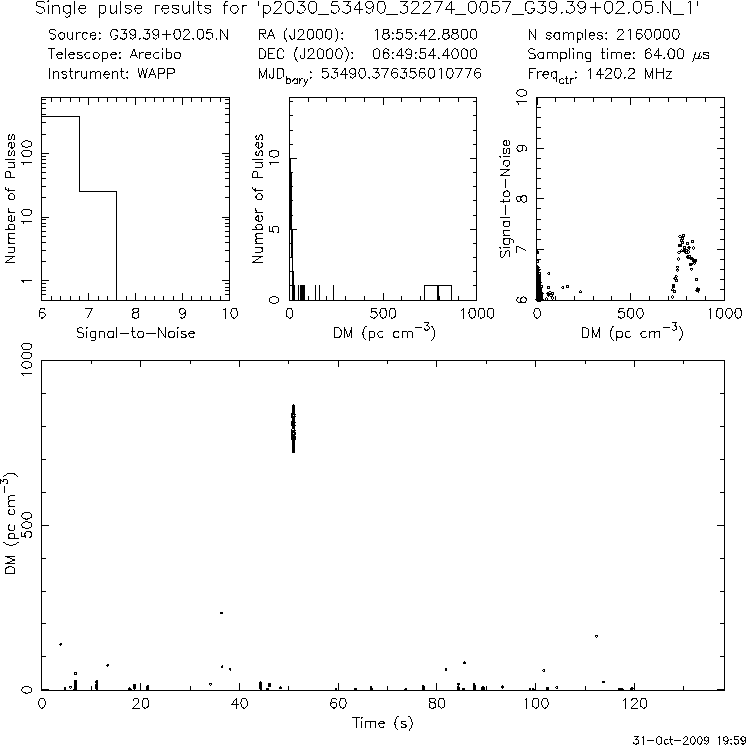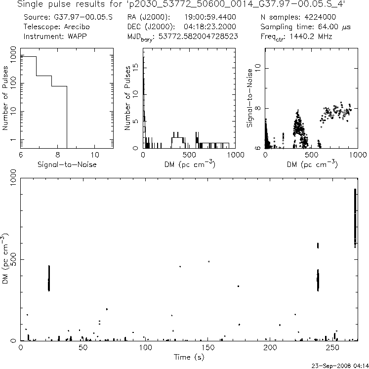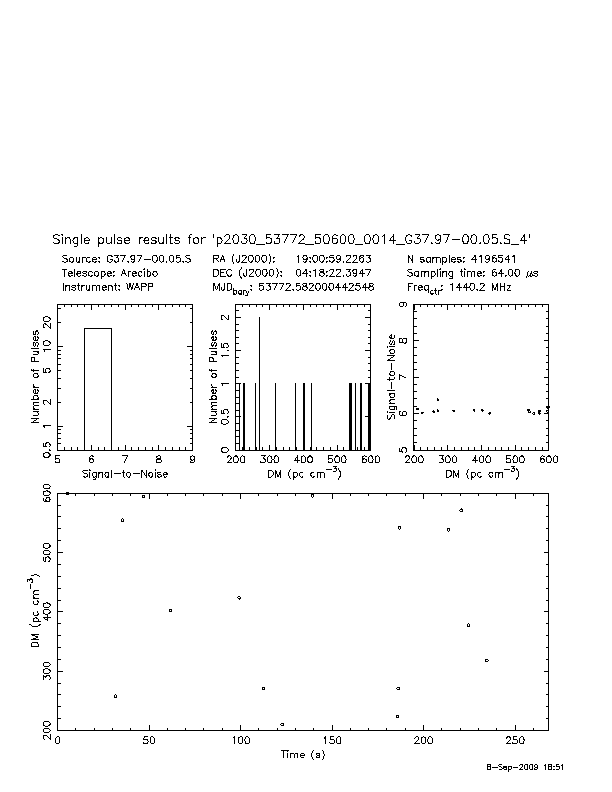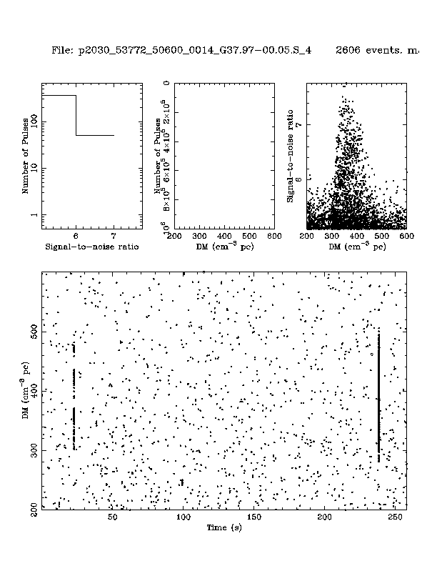 | 6 | p2030 | p2030_53772_50600_0014_G37.97-00.05.S_4 | 350 | 1080 | 8.0 | J1901+0413 (DM=352, S1400=1.1 mJy, 5.3' away) | K | two pulses, NO prepfold detection | yes | no |