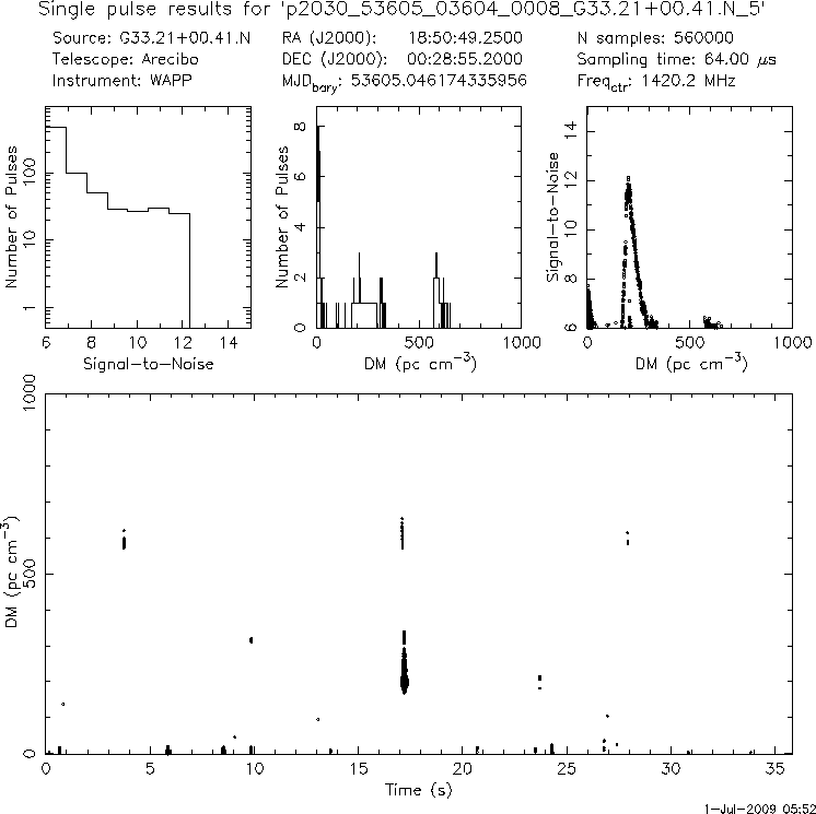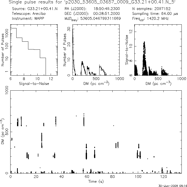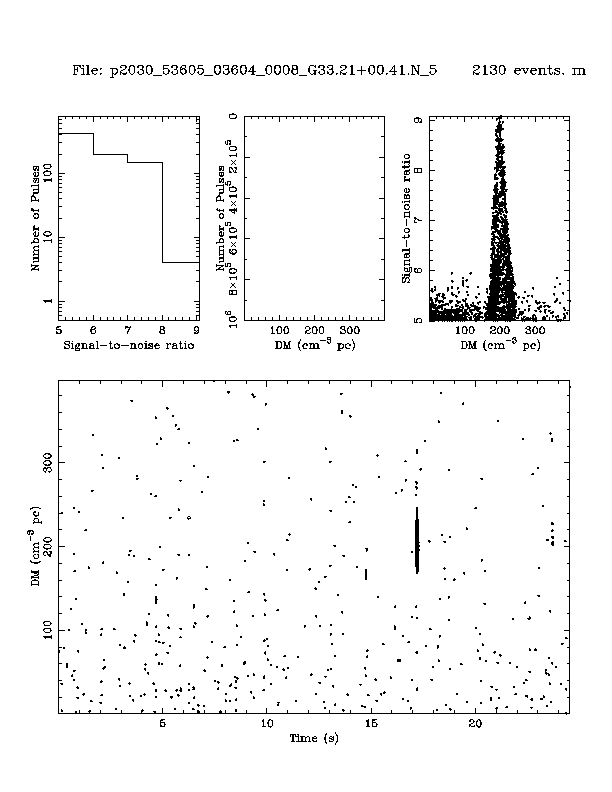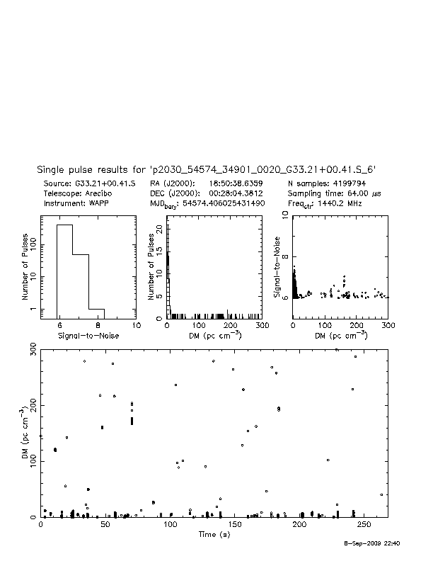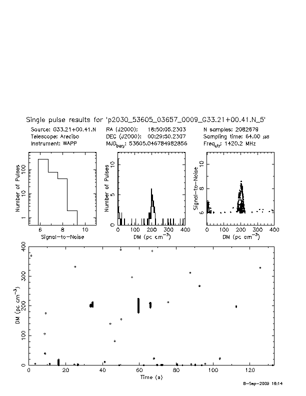 | 12 | p2030 | p2030_53605_03657_0009_G33.21+00.41.N_5 | 200 | 1270 | 10.5 | J1850+0026 (DM=201, S1400=1.0 mJy, 2.6' away) | K | several pulses, strong prepfold | yes | yes |
