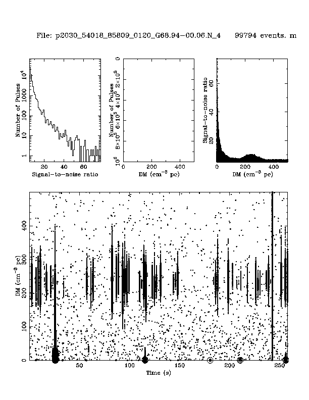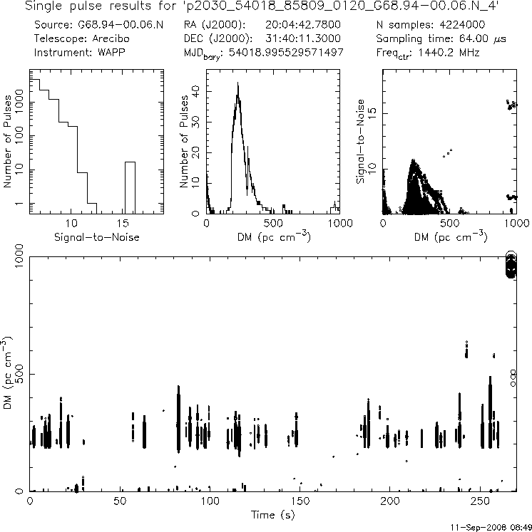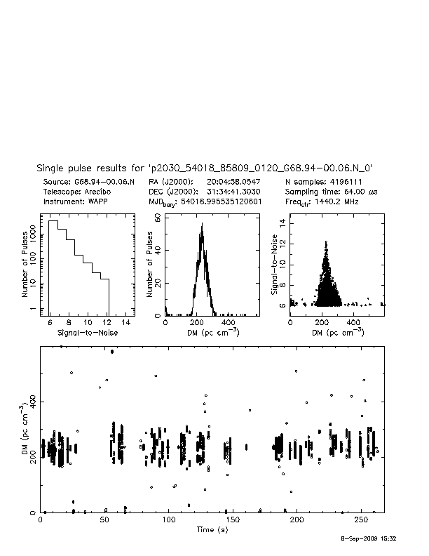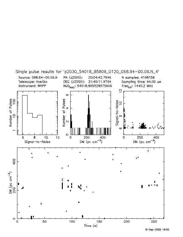 | 4 | p2030 | p2030_54018_85809_0120_G68.94-00.06.N_4 | 230 | 460 | 11.0 | J2004+3137 (DM=235, S1400=1.8 mJy, 3.6' away) | K | many pulses, strong prepfold | yes | yes |