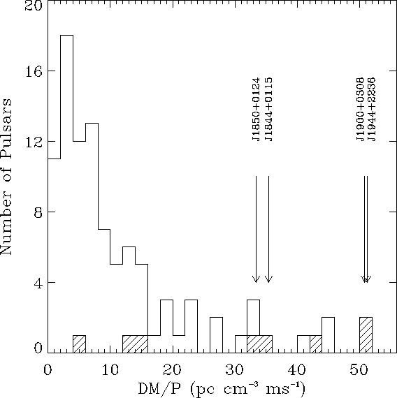 Below: A histogram of DM/P for known Galactic MSPs (unshaded) and newly discovered PALFA MSPs (shaded), including the four MSPs presented on this page. Both data sets are complete up to mid-2012.